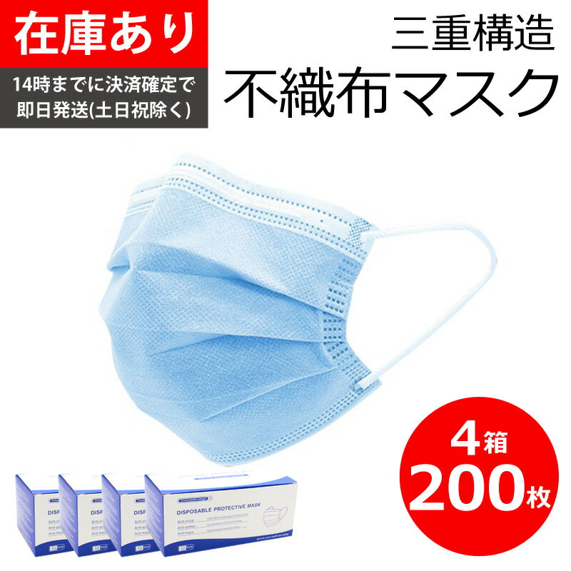 [即納 12500円→6680円在庫処分売りつくしセール]マスク 200枚 在庫あり 使い捨て 送料無料 国内発送 不織布マスク ウイルス 防塵 花粉 飛沫対策 99%カット PM2.5対応 ふつうサイズ 大人用 立体3層不織布 ノーズワイヤー 花粉症 ほこり 50枚X4箱